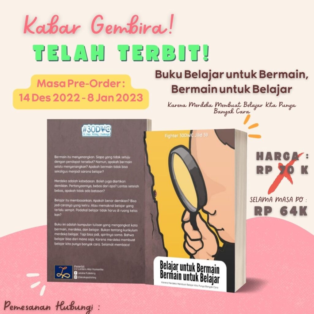 Buku ini adalah kumpulan tulisan yang mengangkat kata bermain, merdeka, dan belajar. Bukan tentang kurikulum merdeka belajar. Tapi bisa jadi, spiritnya sama. Bahwa belajar bisa dari mana. Karena merdeka membuat belajar kita punya banyak cara. Selamat membaca!