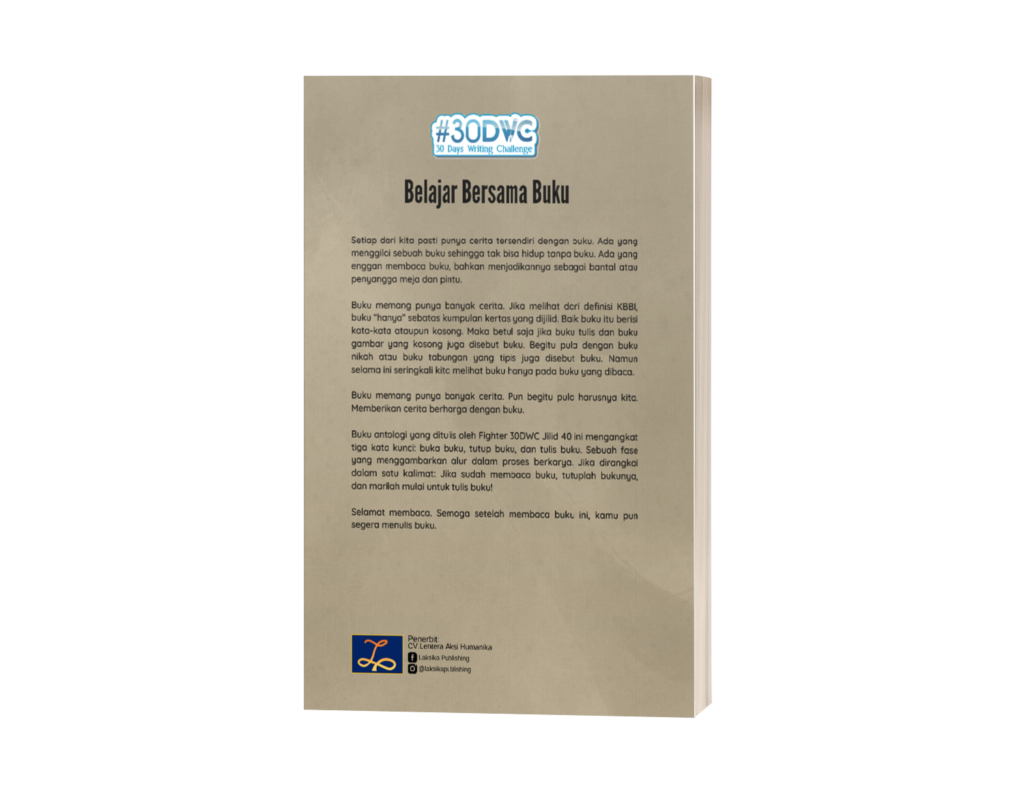 Buku antologi yang ditulis oleh Fighter 30DWC Jilid 40 ini mengangkat tiga kata kunci: buka buku, tutup buku, dan tulis buku. Sebuah fase yang menggambarkan alur dalam proses berkarya. Jika dirangkai dalam satu kalimat: Jika sudah membaca buku, tutuplah bukunya, dan marilah mulai untuk tulis buku!